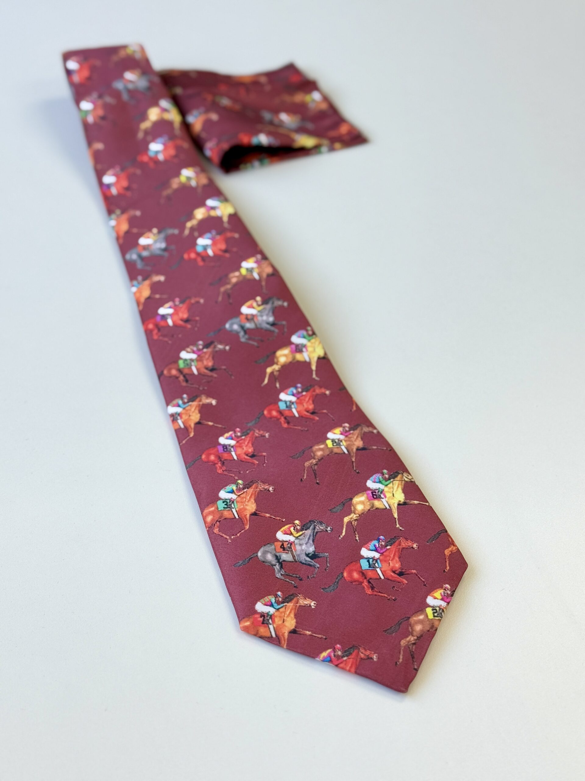A unique maroon tie featuring colorful horse racing prints — perfect for lovers of style and sport.