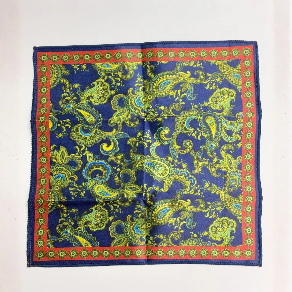 The Regal Blue Paisley Pocket Square features intricate yellow and turquoise paisley motifs framed in a royal red border. Designed for men with refined taste, it brings a luxurious finish to formal suits and festive outfits.